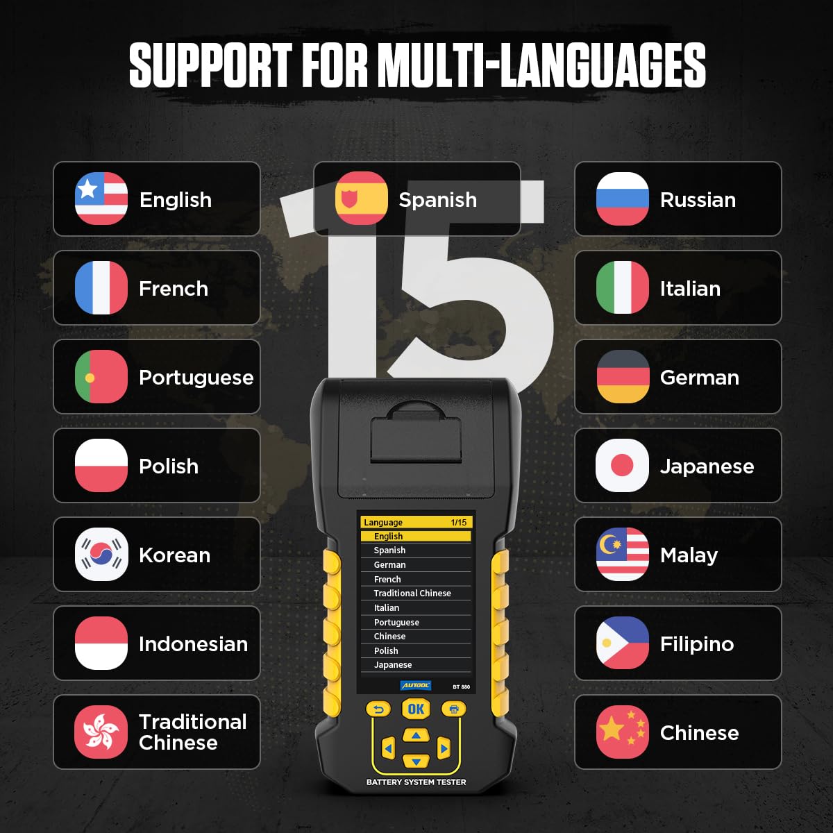 - Battery Testing Function:Selects the appropriate test status, mode, battery type, and testing standards based on the battery's actual conditions. Test results are obtained within seconds by following the on-screen instructions, providing precise evaluation of the battery's status.