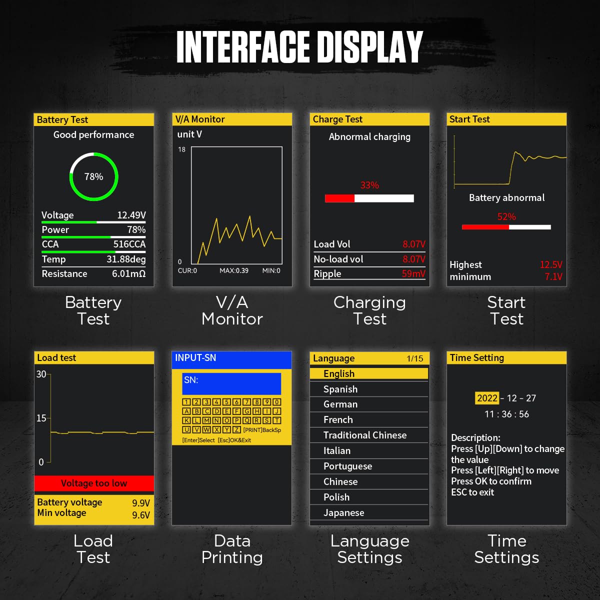 - Five Testing Functions:Offers multiple testing capabilities, including battery test, V/A monitor, charging test, start test, and load test. Allows easy assessment of battery performance.