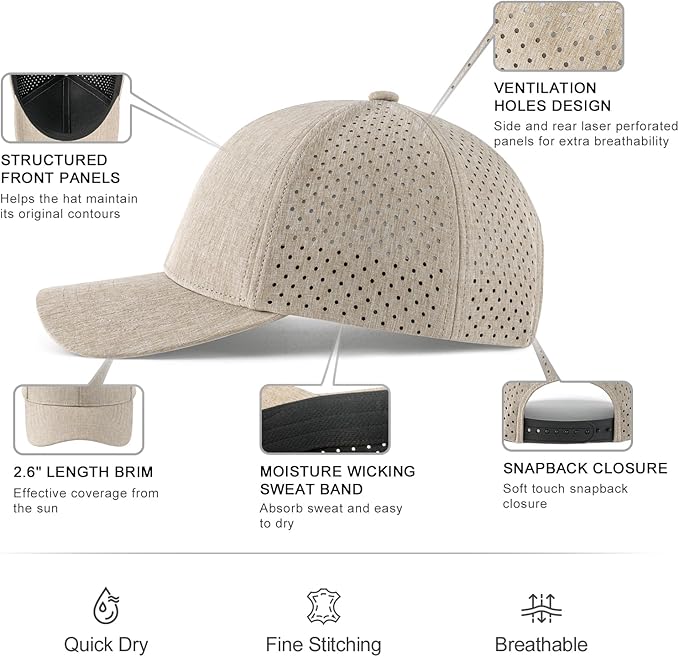 - High Performance: Pre-curved visor provides sun protection, structured front panels and mid crown to maintain shape; Side & back laser cut holes ensures your head breathable, classic snapback closure for an adjustable fit