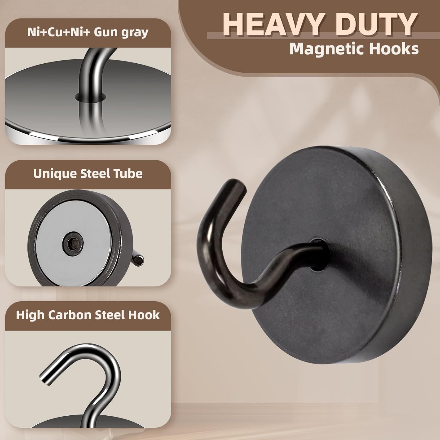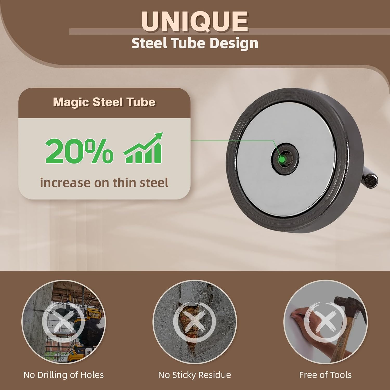 - ✔MAGIC STEEL TUBE DESIGN - Unique design of steel tube inside the base of magnetic hooks greatly increases the attractive force , especially on thin steel! It increase approximately 20% force comparing those none-tube magnets. it solves the problem of weak force on thin steel. Permanent magnetic hook with magic steel tube, strong magnetism lasts forever!