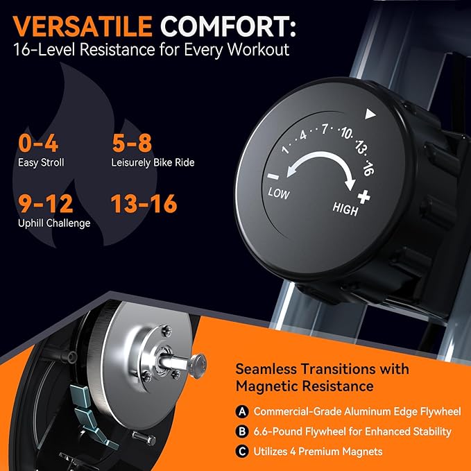 - 16-LEVEL MAGNETIC RESISTANCE FOR ULTIMATE WORKOUT CONTROL: Take your workout to the next level with our bike's 16-level magnetic resistance system! Equipped with four high-grade magnets and a 6.6-pound aluminum-rimmed flywheel, this indoor bike provides seamless and whisper-quiet resistance adjustments. Whether you're just starting out or a seasoned athlete, you can easily find the ideal challenge to push your limits.