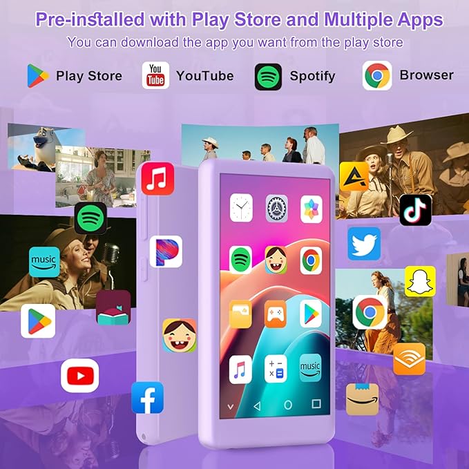 - 【Multiple Music and video Options】 The Bluetooth MP3 Player is equipped with high-quality lossless speakers and has multiple playback modes to immerse you in the world of music. We pre-installed many apps for Spotify, Audible, Android Music Player and so on. and you can download and install any apps you like for HiBy, Tiktok, YouTube, etc. in the app store