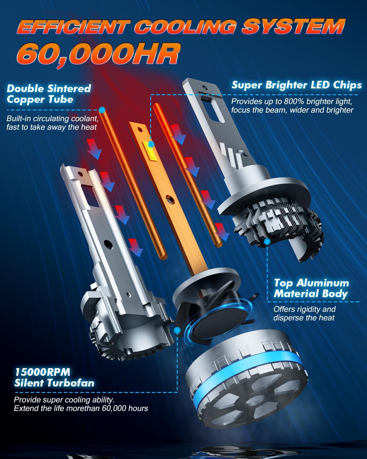 - Durable 70,000+ Hours Lifespan: Built with aerospace-grade aluminum and an advanced heat sink design, these h11 9005 fog light bulbs are equipped with a powerful 15,000 RPM turbo cooling fan. This ensures a lifespan of over 70,000 hours, reducing the need for frequent replacements and providing reliable long-term performance.