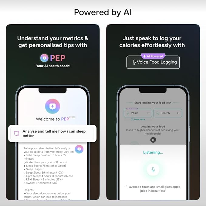 - AI POWERED: PEP, VOICE BASED FOOD LOGGING: PEP is your AI-powered health coach that decodes your fitness, sleep, and stress metrics. It tracks changes and gives personalised, actionable tips to keep you on track. Also, with Voice-based food logging you just speak into your phone to log meals - making nutrition tracking quick, easy, and hassle-free.