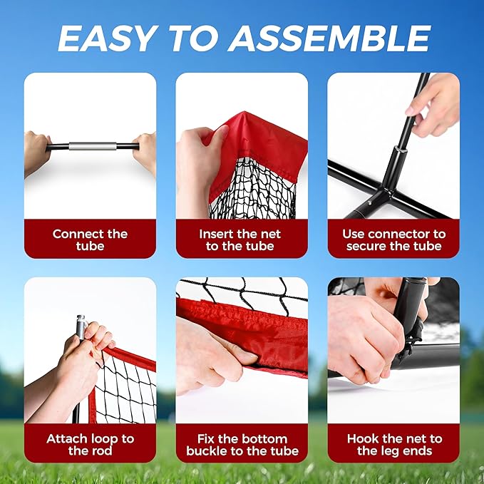• STRONG FRAME AND 7-LAYER RIPPING RESISTANT MESH- The baseball practice net is made of 7 layers of knot-free, thickened ripstop mesh that is stronger and more abrasion-resistant to withstand the most powerful hits and throws. High-strength fiberglass poles provide excellent support, keeping the softball net in shape and preventing it from sagging during intense use.4 U-shaped sharp ground stakes ensure easy attachment to outdoor grass and provide excellent resistance to strong winds.