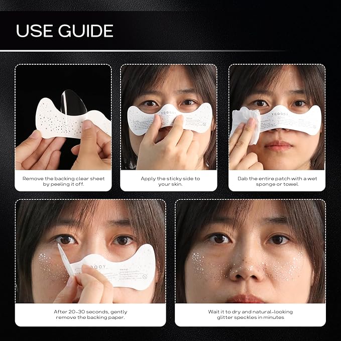 - INSTANT MAKEUP OUTFIT CHANGE: Using our facial glitter spot patches is effortless! Peel off backing and apply sticky side to your skin. Afterwards, wet a towel and apply pressure to patch for 60 seconds. When makeup patch is finally removed, reveal your beautiful new glitter spotsQuickly change the look, saving time and efficiency.