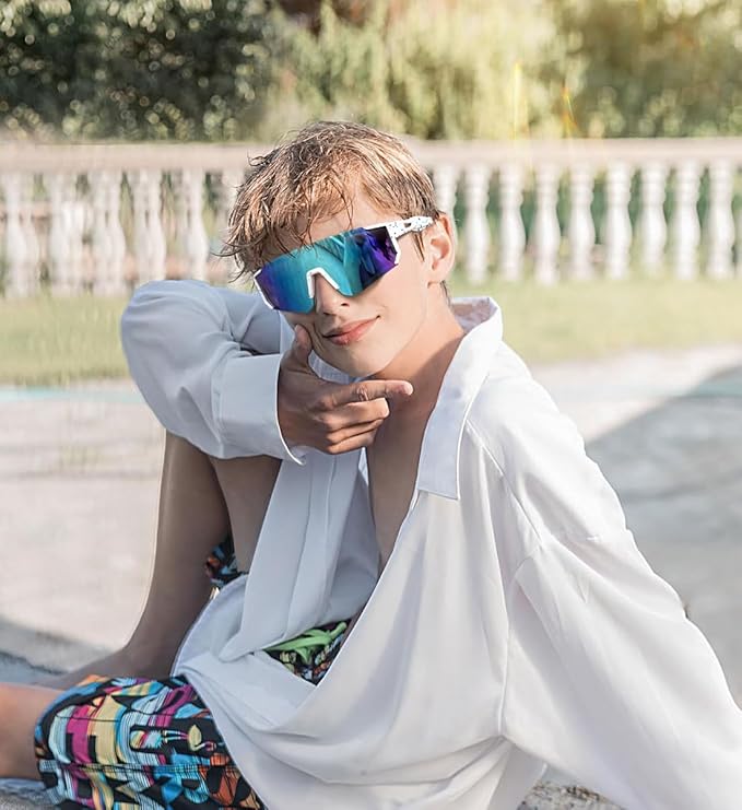 • 【Wraparound Fit】 - The wraparound design of these boys sunglasses provides an expansive field of vision, this design not only enhances visual clarity but also ensures a snug and secure fit, preventing the sunglasses from slipping off during active play.