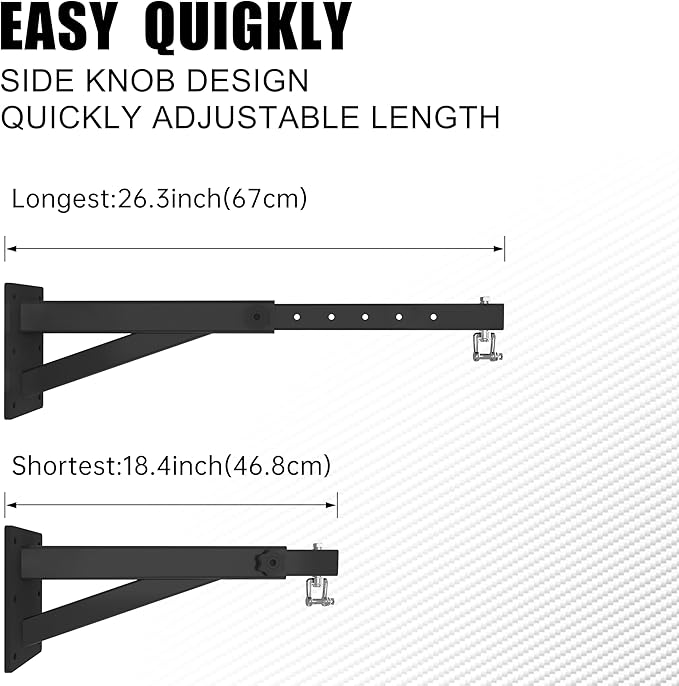 - 【 Adjustable Length 】: The wall mounted sandbag hanger can be adjusted to 18-26 inches according to your needs, This makes it suitable for all sizes of boxing bag, kickboxing bag, Muay Thai bag and other similar equipment. This adjustable punching bag mount is perfect for all your training needs