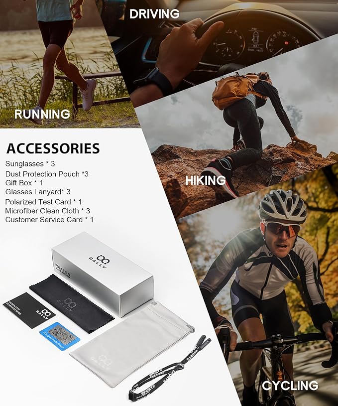 • Gift Ideas Package and Brand Customer Service: You will receive: Classic sunglasses*3, microfiber pouch*3, microfiber glasses cleaning cloth*3, glasses rope*3, polarized test card*1, gift box*1. All customers enjoy brand customer service for mens sport sunglasses. If you have any questions when you receive these sports sunglasses for men, please contact us in time, we will solve the problem for you as soon as possible