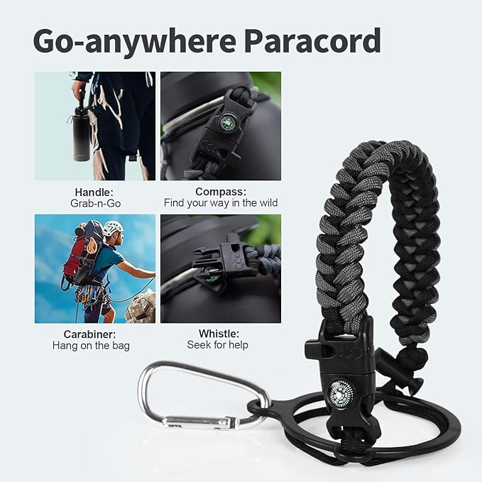 - Palm Fitting Paracord Handle: Compared to handle lids, nylon paracord on the bottle gives you more choices in terms of color coordination and coziness on your hands. Match the handle with your bottle to make a complete outdoorsy look. Compass and carabiner can be lifesavers for hiking and other expeditions