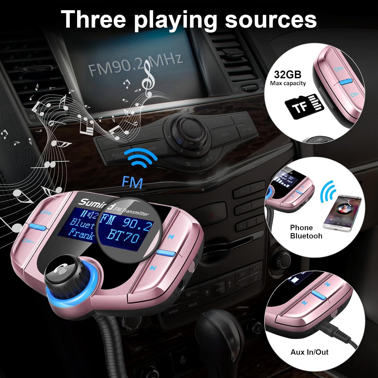 Upgraded Bluetooth FM Transmitter, Wireless Radio Adapter Hands Free Car Kit with 1.7'' Display, QC3.0 and Smart 2.4Amp Dual USB Ports, AUX Input/Output, TF Card Mp3 Player (PD, Rose Gold)