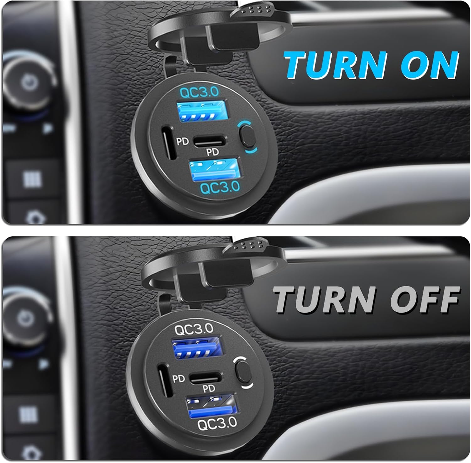 - 【Premium material】This car usb port is made of a heat dissipating nylon casing, which is non-flammable, wear-resistant and stable. The switch on the right turns the power off to avoid draining the battery. In addition, the protective cap above the 12 volt usb charging port is waterproof and prevents the charger from sudden splashes of water.