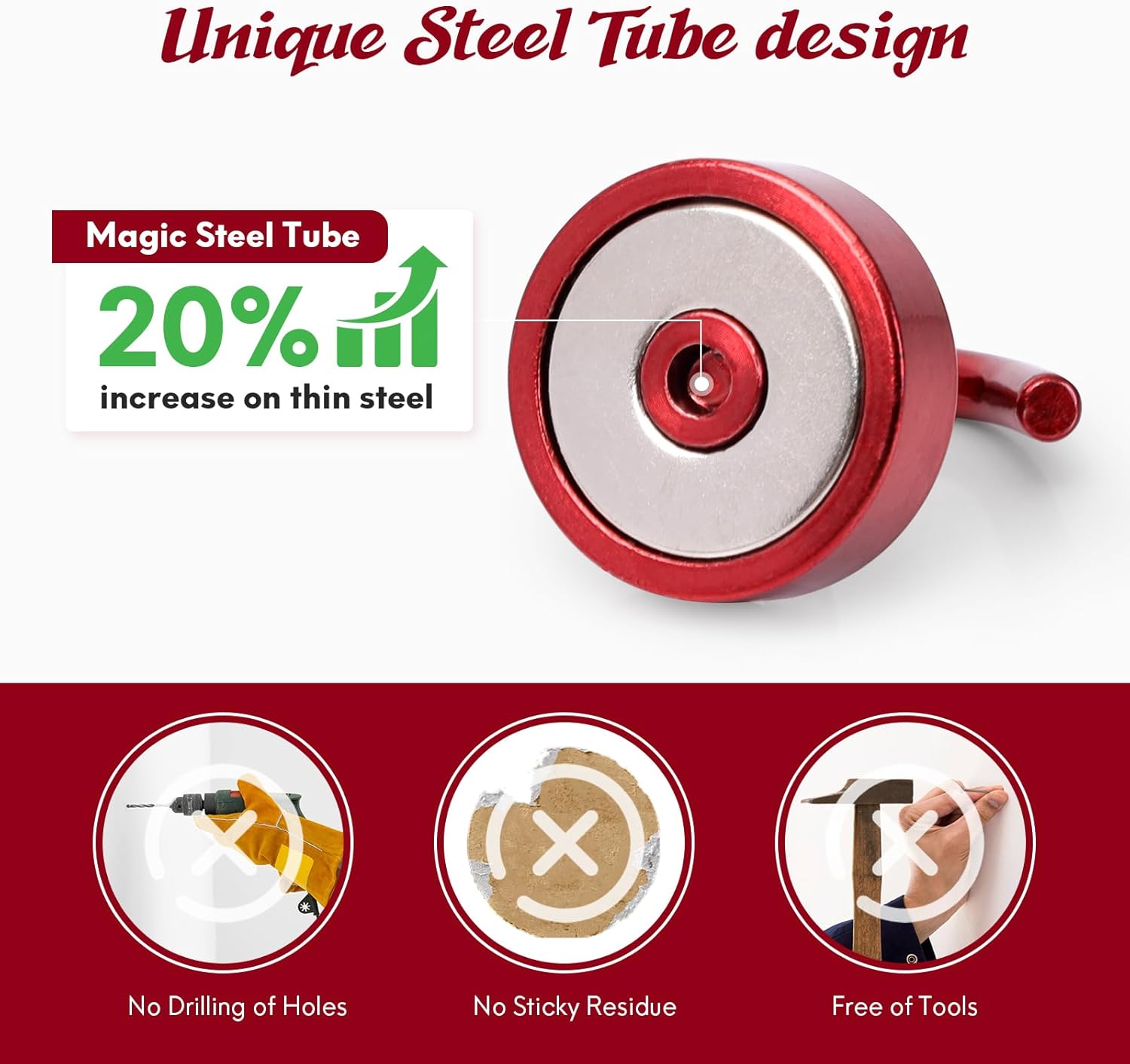 - ✔MAGIC STEEL TUBE DESIGN - Unique design of steel tube inside the base of magnetic hooks greatly increases the attractive force , especially on thin steel! It increase approximately 20% force comparing those none-tube magnets. it solves the problem of weak force on thin steel. Permanent magnetic hook with magic steel tube, strong magnetism lasts forever!