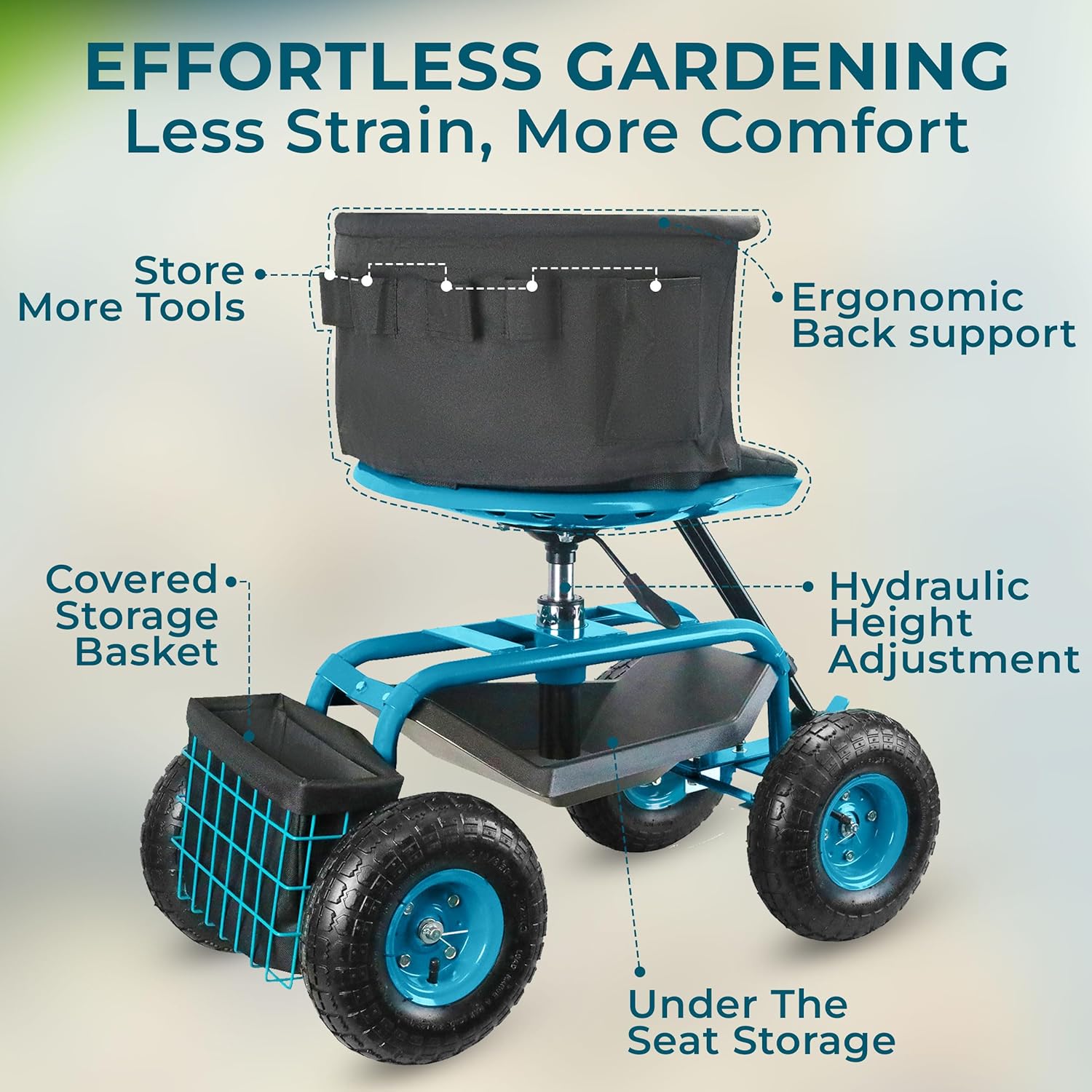 Garden Seat with Wheels – Adjustable 360° Swivel Gardening Stool with Hydraulic Height Adjustment, Ergonomic Backrest, and Tool Storage – Rolling Stool for Garden, Yard, and Outdoor Use