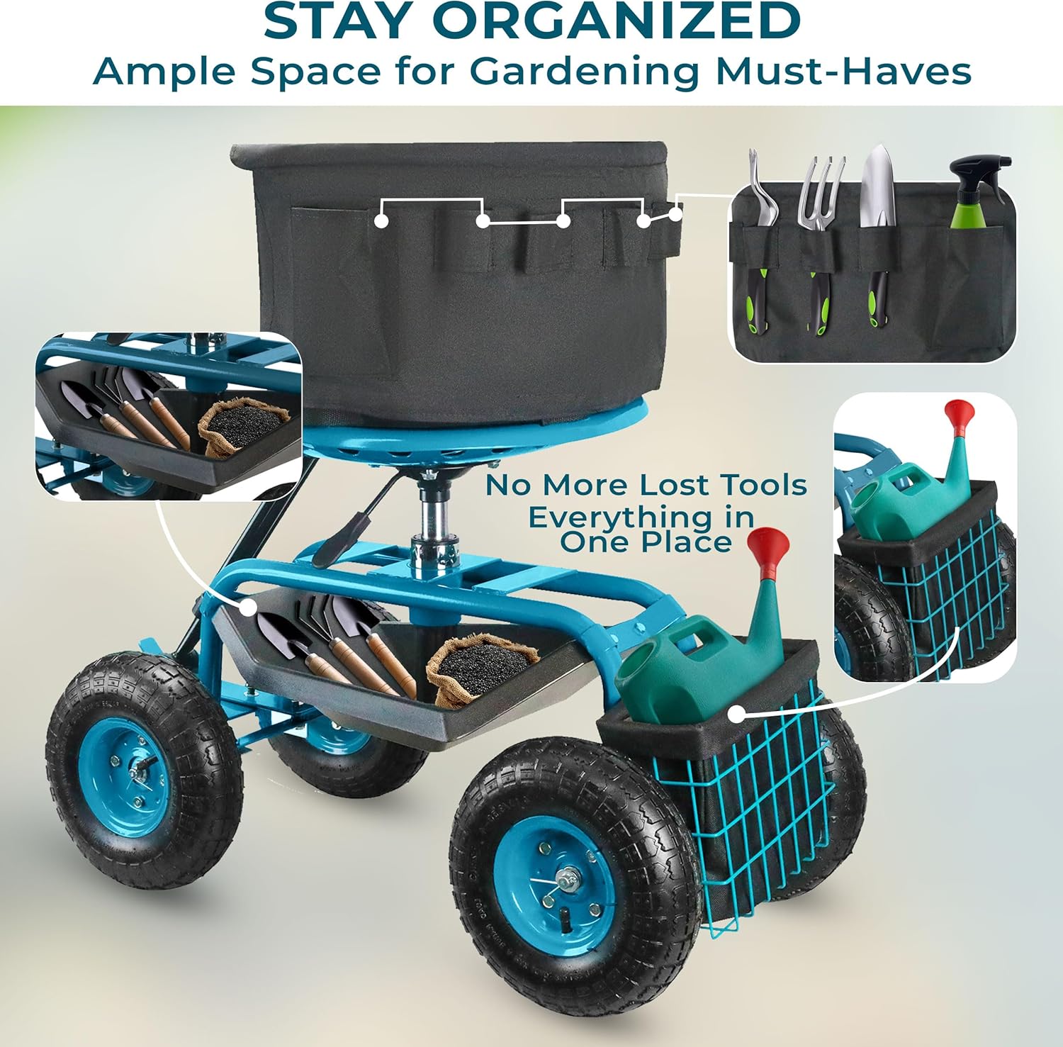 - Large Storage Capacity: Organize all your gardening tools with Luxe Function’s multiple storage options, including a spacious back basket, under-seat tray, and extra backrest pouch.