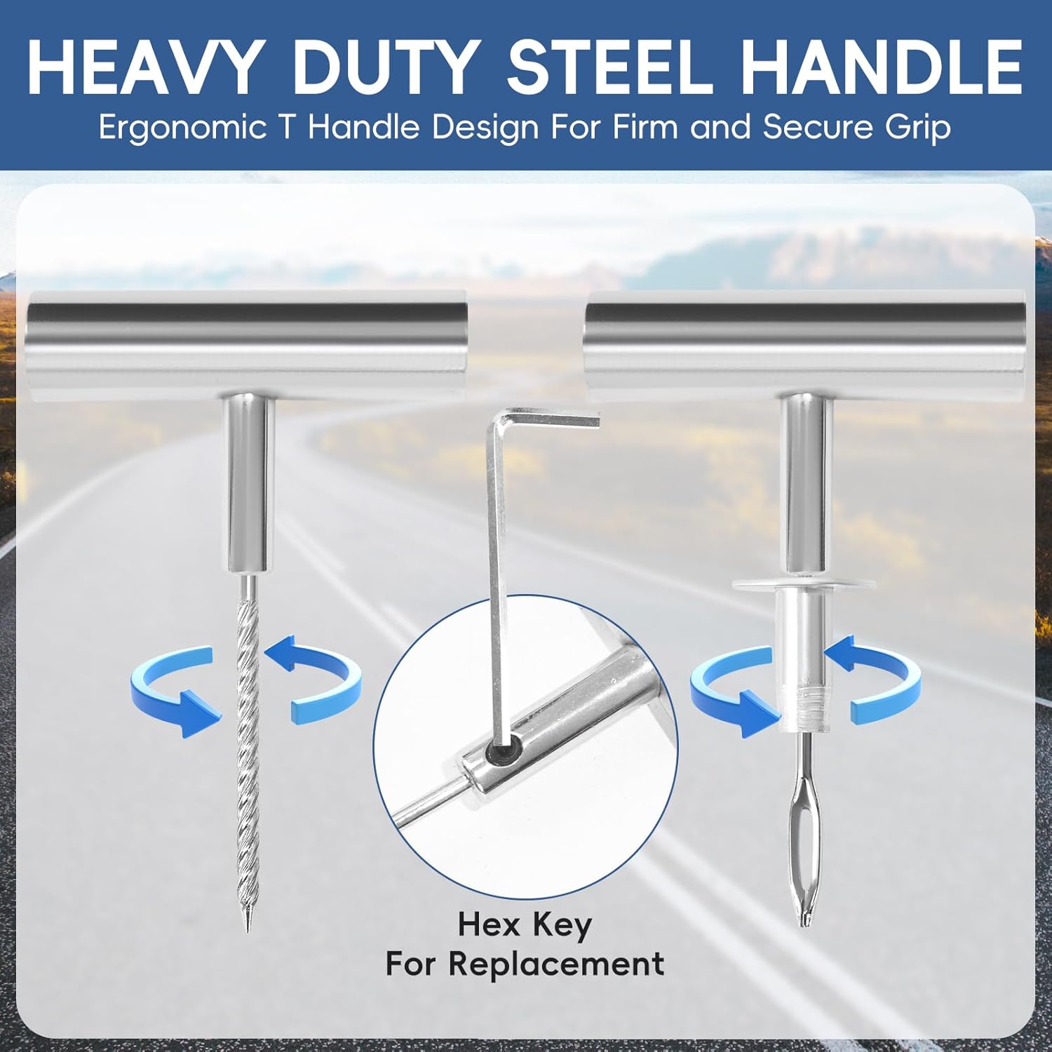 - Easy to Use: Our tire plug kits come with everything you need, including a T-handle and spiral probe tool that make piercing into any tire easy. The portable storage case takes up very little space, making it easy to carry with you wherever you go.