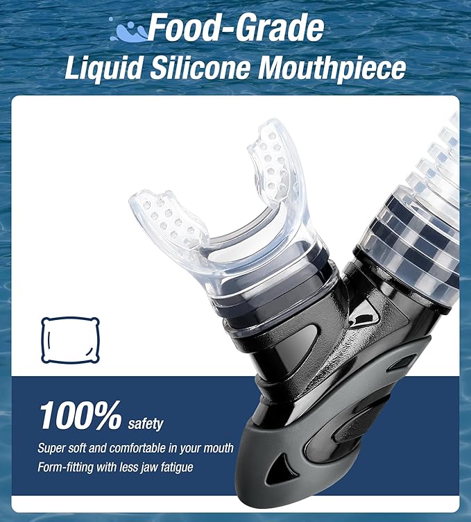 - Advanced top dry valve and splash guard: Aegend Dry snorkel profiled “paddle” dry top automatically closes when submerged, not allowing water entry. Even waves crash overhead, the splash-guard will prevent water from coming into the snorkel. Unlike the float ball valve which gets lodged easily by small sands or kinds of stuff, our new design valve won't be stuck, which give you comfortably breath.