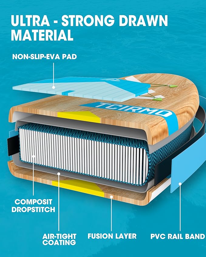 - 【WELDED RAIL TECHNOLOGY】: The Heat-Welded Rail Technology creates a completely airtight, mechanically bonded seam without the risk of glue weakening over time. This makes inflatable paddle board stronger and longer lasting.