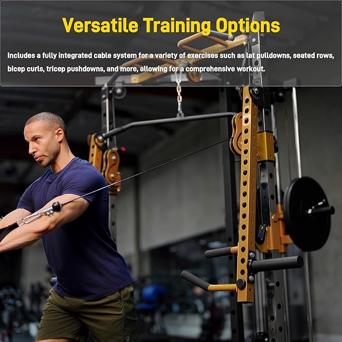 - Versatile Training Options: Includes a fully integrated cable system for a variety of exercises such as lat pulldowns, seated rows, bicep curls, tricep pushdowns, and more, allowing for a comprehensive workout.