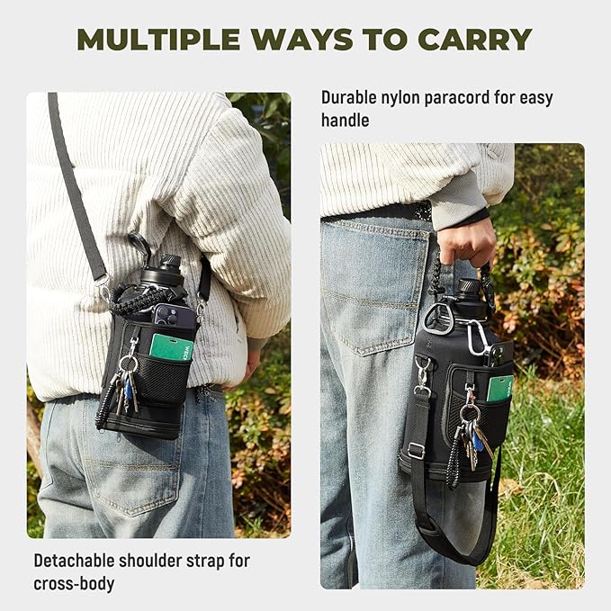 - Iconic Paracord Handle and Carrying Pouch: This insulated water bottle comes with a beautiful hand knit nylon paracord in coordinated color with the water bottle. This paracord handle is a must-have as a full functional camping / hiking flask. And storage carrying pouch with removable shoulder strap for convenient hands free carrying! The safe zippered pocket design to stores all your stuff, holds your cards & phone & key