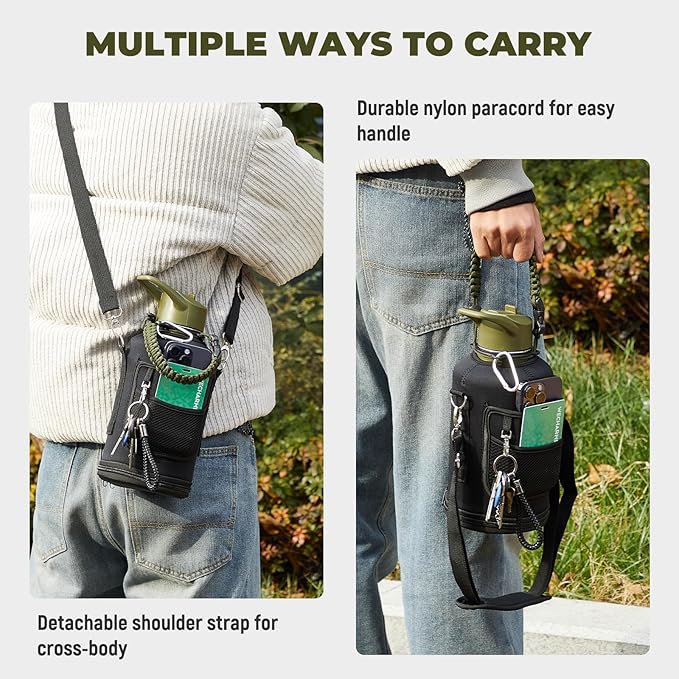 - Iconic Paracord Handle and Carrying Pouch: This insulated water bottle comes with a beautiful hand knit nylon paracord in coordinated color with the water bottle. This paracord handle is a must-have as a full functional camping / hiking flask. And storage carrying pouch with removable shoulder strap for convenient hands free carrying! The safe zippered pocket design to stores all your stuff, holds your cards & phone & key