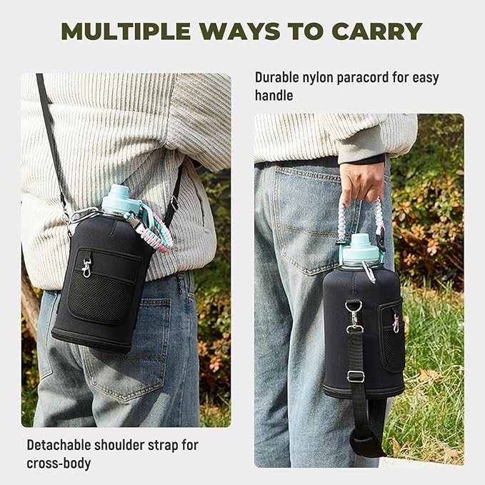 - What You'll Get: Buy 2 pack half gallon insulated water bottle, independent carton packaging,get double accessories (Carrying Pouch, Straw Lid with 2 Straws & Straw Brush, Spout Lid, Paracord Handle, Bottle Brush). We offer Continuous After-sales Service and 100% customer satisfaction against any leakage or insulation failure