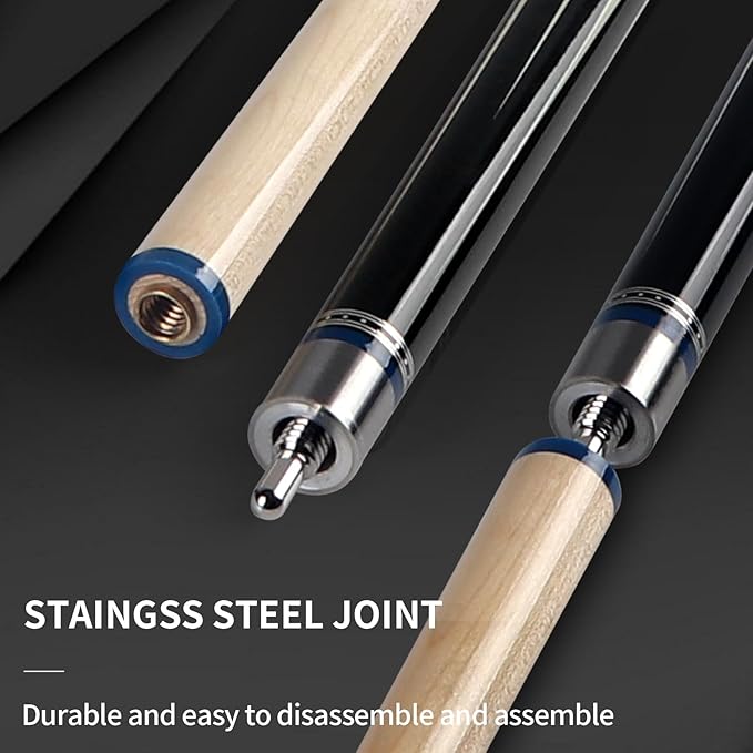 - Professional cue sticks: Kmise 58-inch 2-piece detachable pool stick, weigsht 21OZ, made of high-quality Canadian hard rock maple, stainless steel joints, sturdy and durable and not easy to deform
