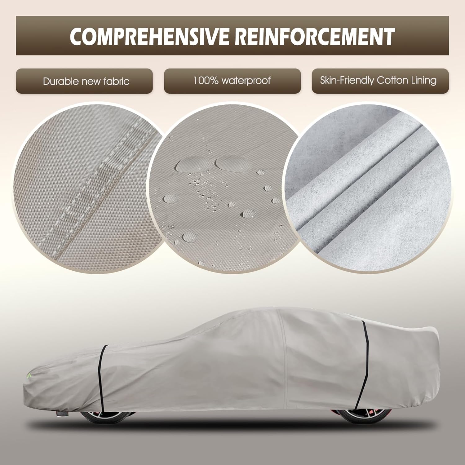 - High-Quality Material: Migaven car cover features a multi-layer composite material design. Layer 1 is PA coating, providing 100% waterproofing. Layers 2 consist of PE, enhancing breathability and maintaining suitable interior temperatures. Layer 3 is an aluminum membrane that reflects 99% of UV rays, reducing UV damage. Layers 4-5 are PEVA material, with strong tear resistance to maintain integrity in harsh weather. Layer 6 is soft cotton, effectively safeguarding the car's paint.