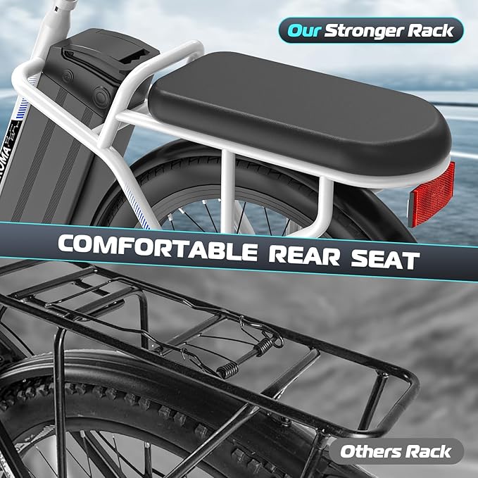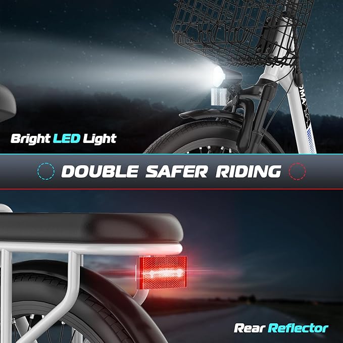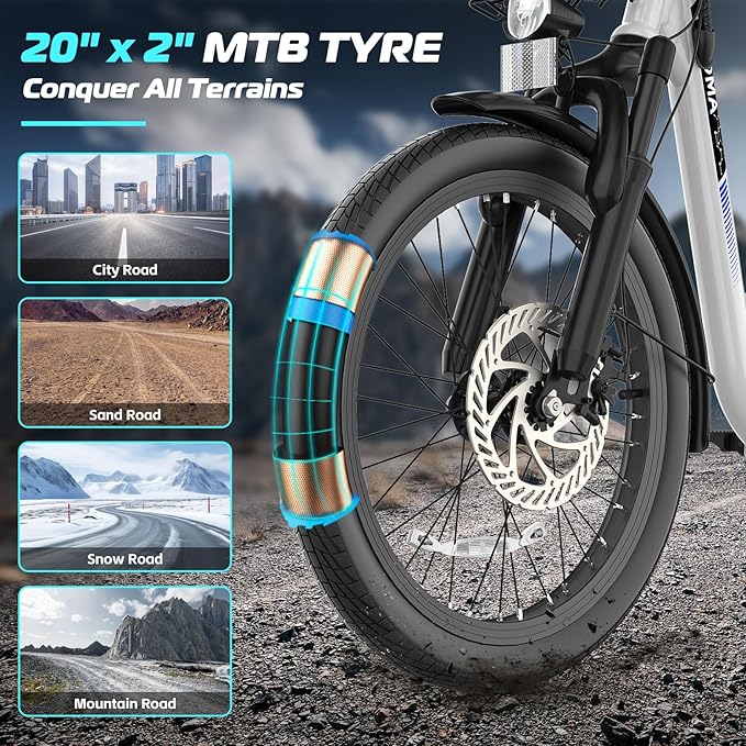 - 【Safe Ebike Configuration】20 inch electric bike for adults adopts a front shock absorber to smooth out bumps, rocky and uneven terrain. The added fenders protect your bike away from mud and water. The smart LCD display provides battery life real-time data. Other reliable e-bike designs like mechanical dual disc brakes, LED headlight and electric horn system and reflectors, safeguard your safety.