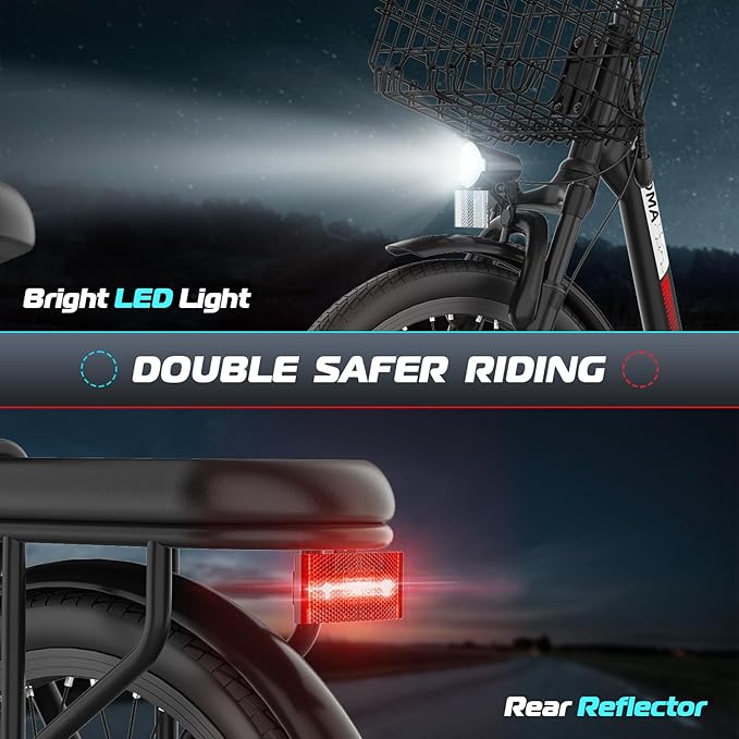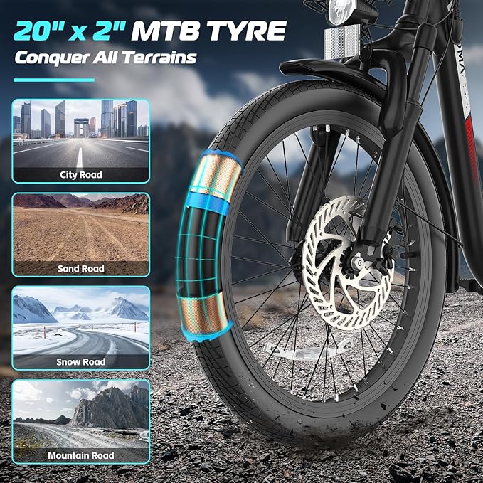 - 【Safe Ebike Configuration】20 inch electric bike for adults adopts a front shock absorber to smooth out bumps, rocky and uneven terrain. The added fenders protect your bike away from mud and water. The smart LCD display provides battery life real-time data. Other reliable e-bike designs like mechanical dual disc brakes, LED headlight and electric horn system and reflectors, safeguard your safety.