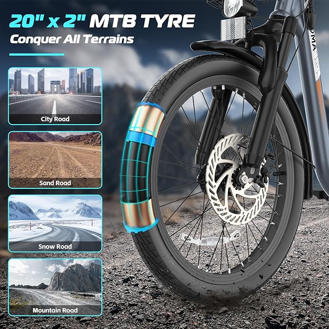 - 【Safe Ebike Configuration】20 inch electric bike for adults adopts a front shock absorber to smooth out bumps, rocky and uneven terrain. The added fenders protect your bike away from mud and water. The smart LCD display provides battery life real-time data. Other reliable e-bike designs like mechanical dual disc brakes, LED headlight and electric horn system and reflectors, safeguard your safety.