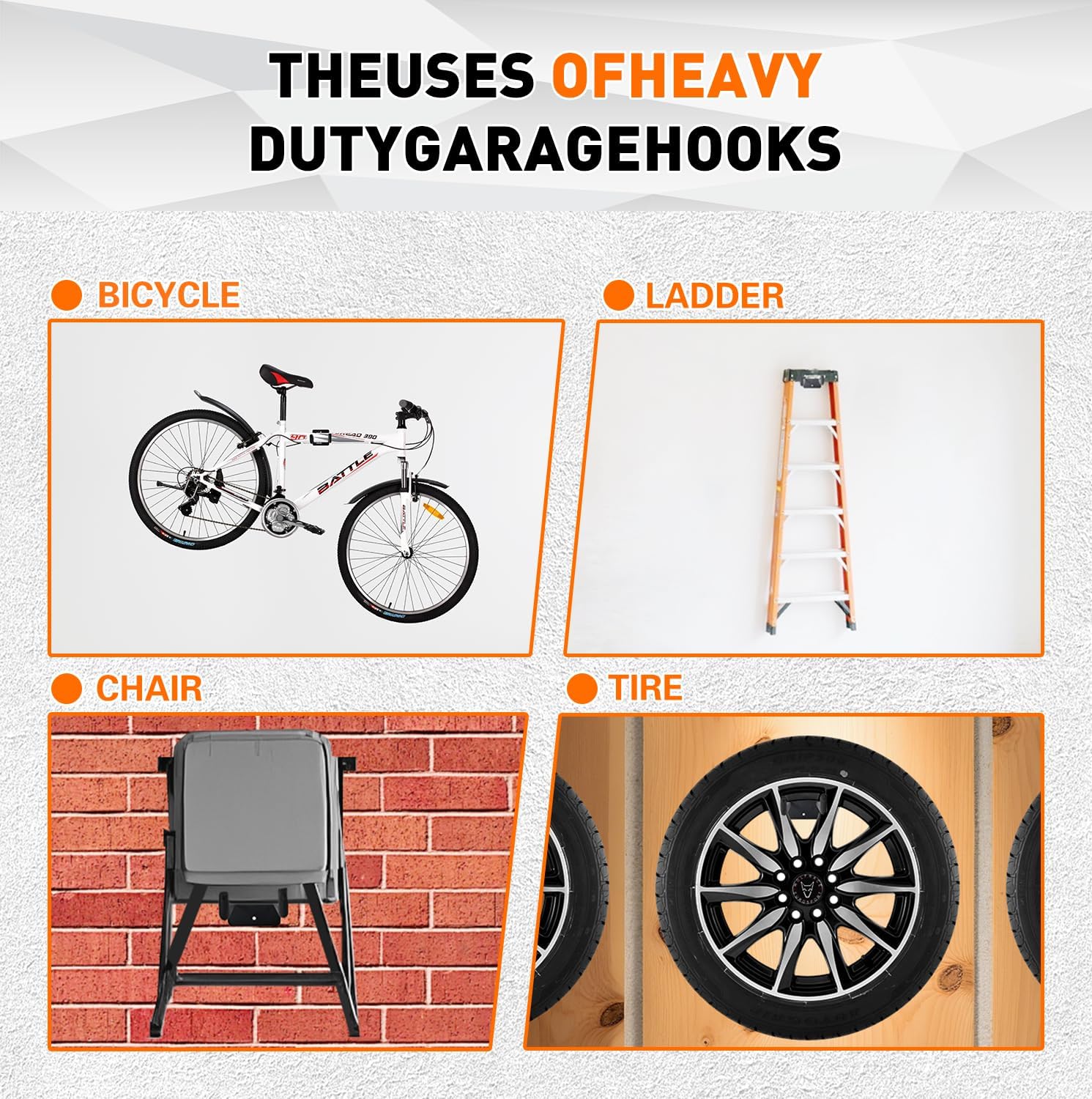 - Extra large 14 inch garage hooks heavy duty made of durable steel carry more and larger objects than any other hook. you can confidently hang tools and other heavy objects, such as skis, tire racks, hoses, ropes, cables, brooms, gardening tools, rain boots, rakes, shovels, racks, etc.
