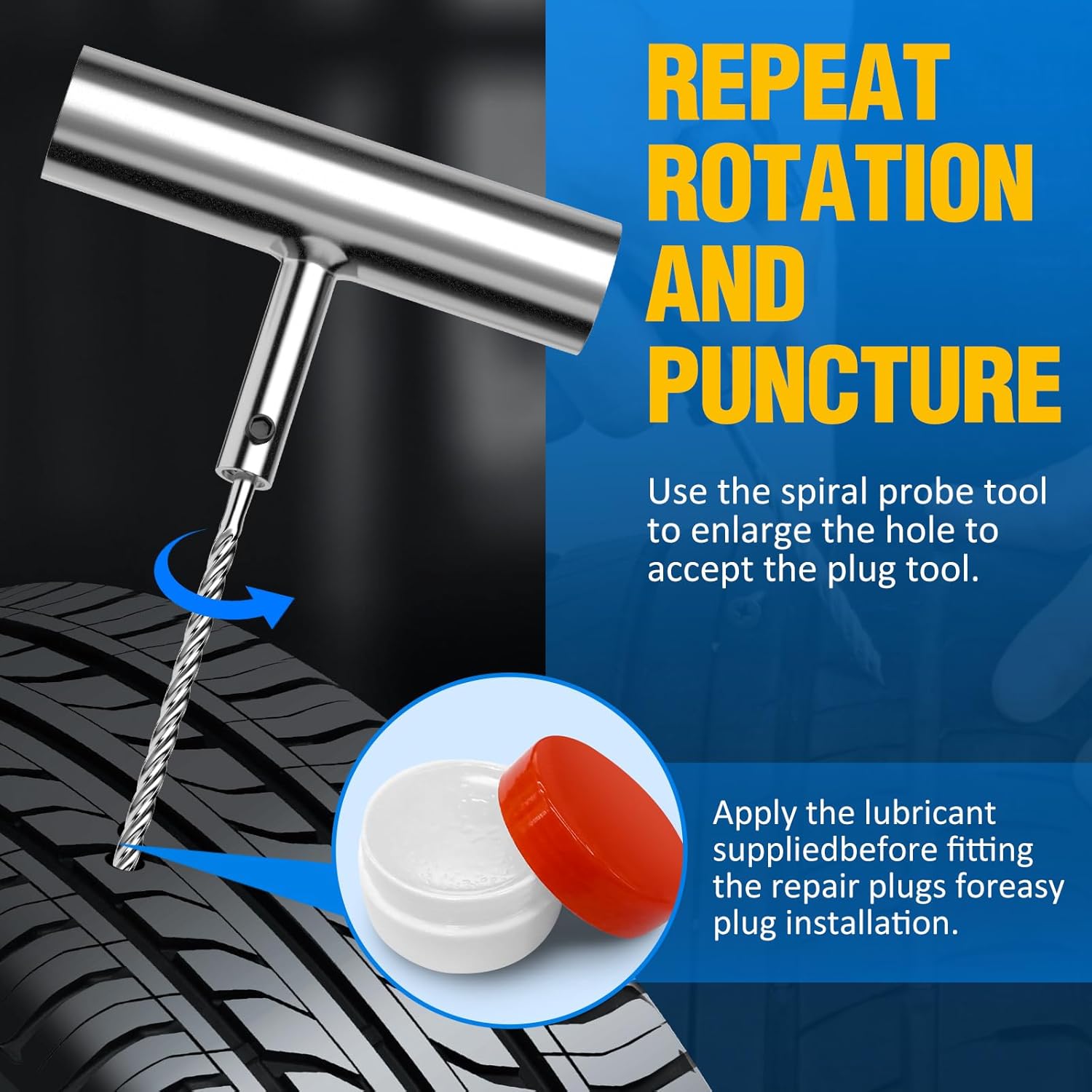 - A COMPLETE KIT: Includes 1pc T-handle insert tool & 1pc T-handle spiral probe tool; 1pc Replacement spiral tool; 15pcs self-vulcanization repair plugs; 1pc jar of lubricant; 1pc Utility knife; 1pc Storage case; 1pc “L” hex key; 1pc Manual