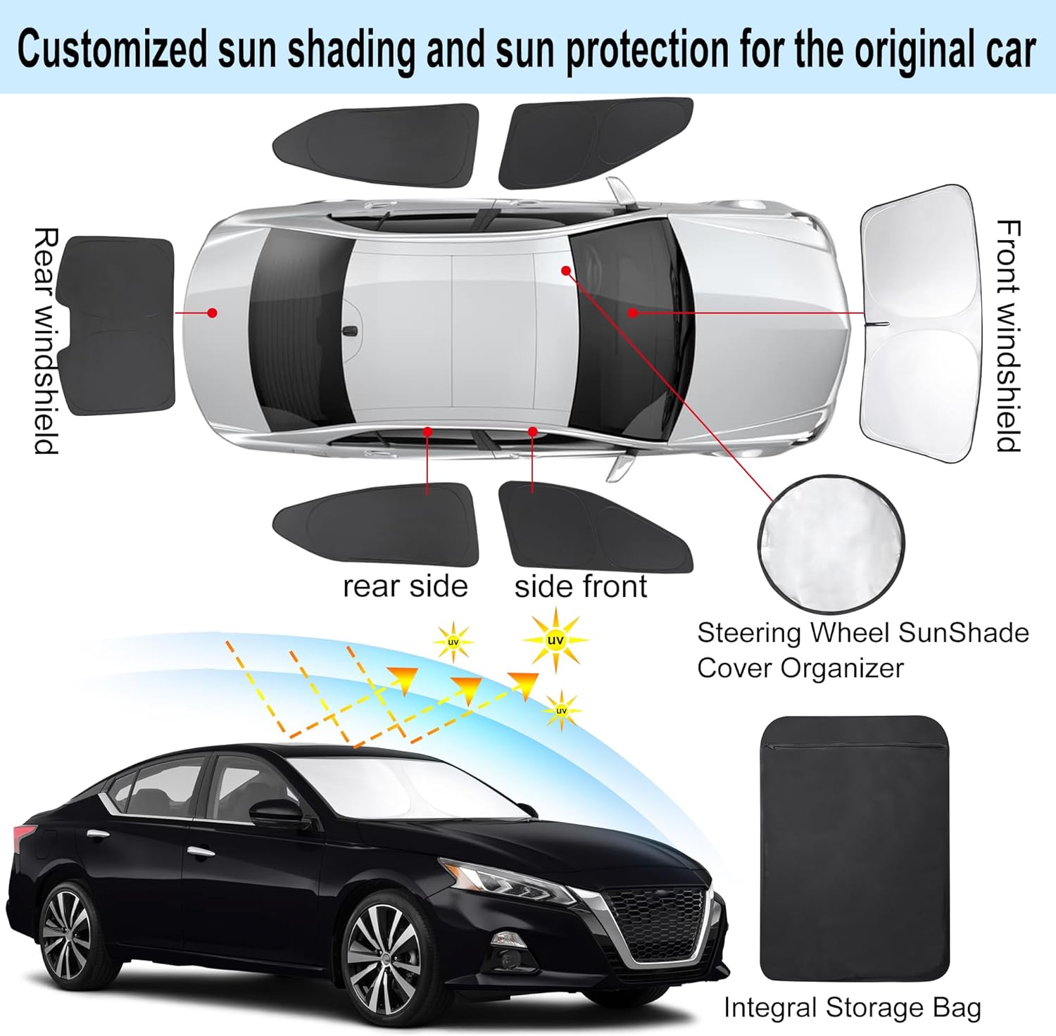- Customized Design:The sun shade custom fit for Nissan Altima 2019-2024 2025.Our window shade is according to the car size design,perfectly fit your car and does not need to trim.windshield sun shade solve the problem of light leakage and incompatibility of the old umbrellas.The sunshade designed for Nissan Altima.