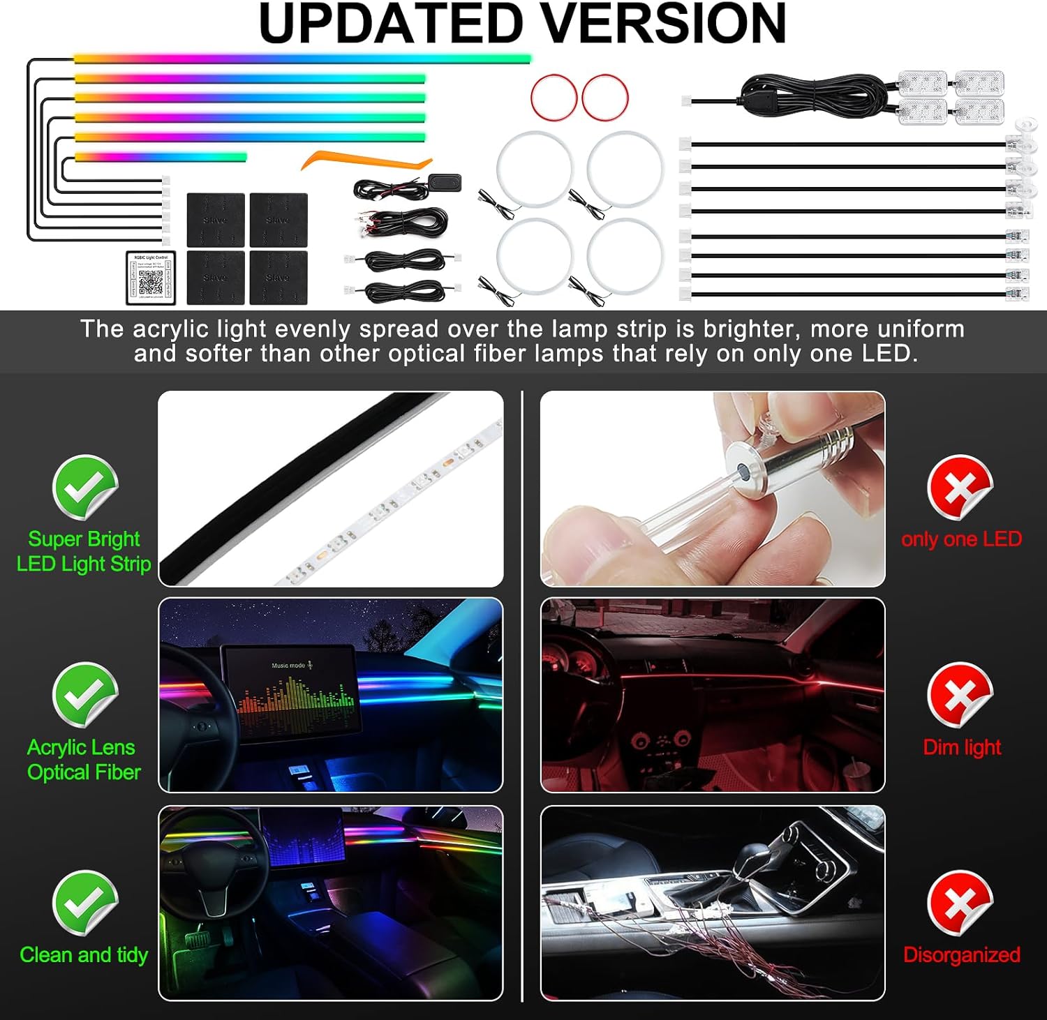 - 【High Bright & Uniform】The Dream+color Acrylic LED Car Ambient Interior Lighting have super bright LED and acrylic lens and contains 6 LED strips (4*29.5inch+1*43.3inch+1*14inch), Foot well lamp*4(44.5inch*2/64.9inch*2) and Door handle light*4+doors storage box light*4 (21.6+21.6inch)+Door horn light*4(5.9inch+ line 19inch*1),also comes with 1 main controller and 4 sub controllers,and can be flexibly installed on any car by DIY without disorganized, which is plug and play, and this acrylic light evenly spread over the lamp strip is brighter, more uniform and softer than other optical fiber lamps that rely on only one LED.