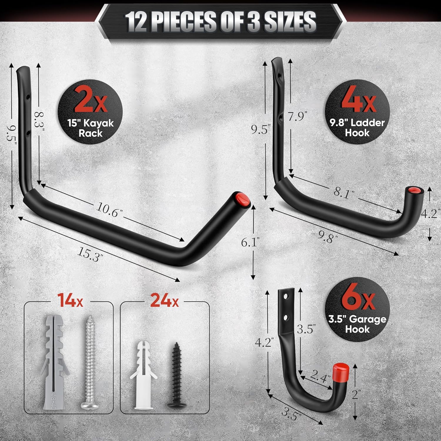 - Complete 12-in-1 Suite for Your Workspace: We provide 12 pieces of 3 sizes garage hooks for Hanging, including 2*15" Kayak hooks, 4*9.8" Garage hooks, 6*3.5" utility hooks. designed to create an efficient storage space for kayaks, paddleboards, snowboards, surfboards, canoes, folding chairs, ladders, garden hoses, tools, bikes, and other bulky items. Elevate Your Organization—Get Your Nacial Garage Hooks Today!