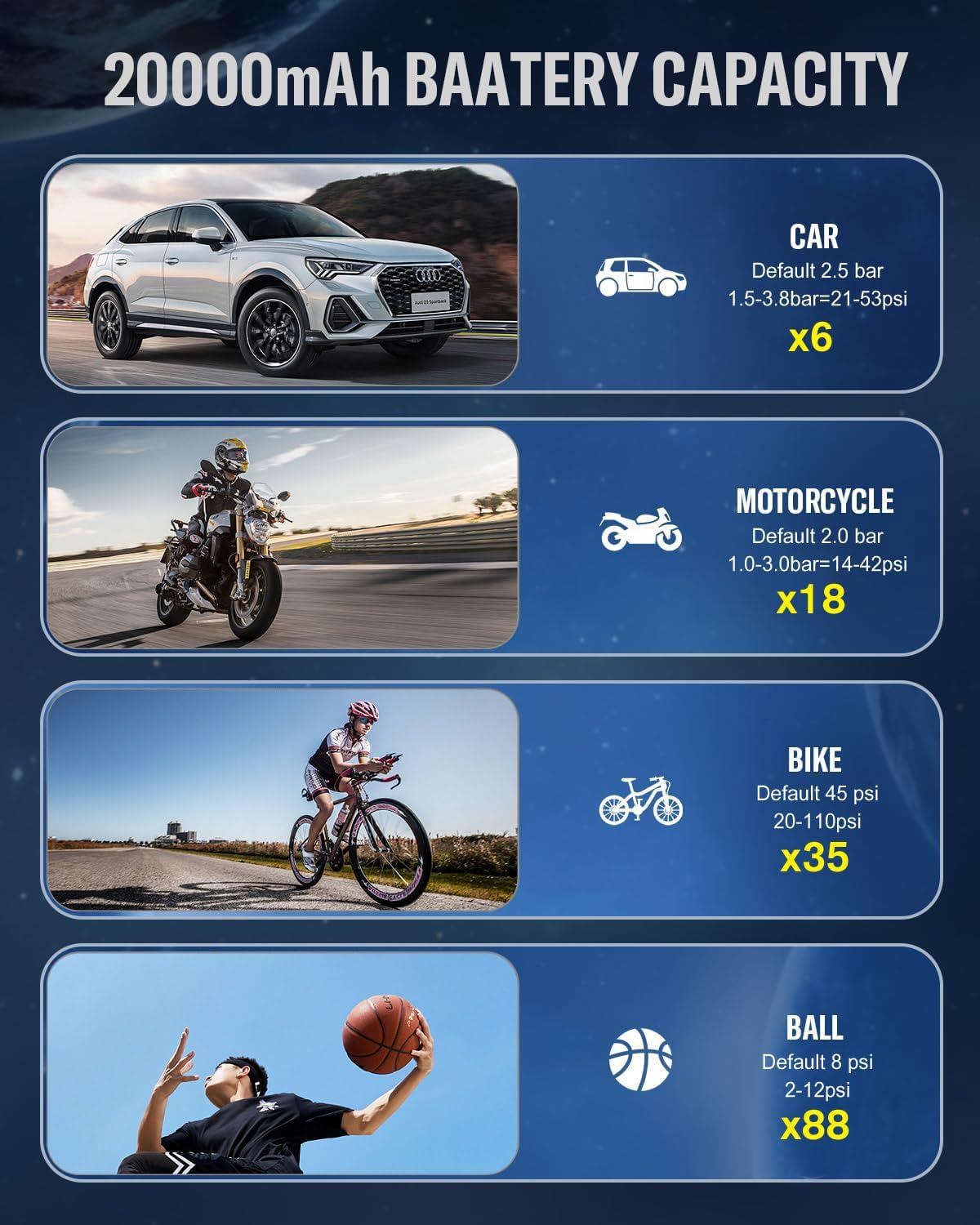 Tire Inflator Portable Air Compressor,180PSI 20000mAh Pump for Car Cordless with Pressure Gauge,4X Fast Inflation with Dual Lights for Cars Bicycles Motorcycles Balls