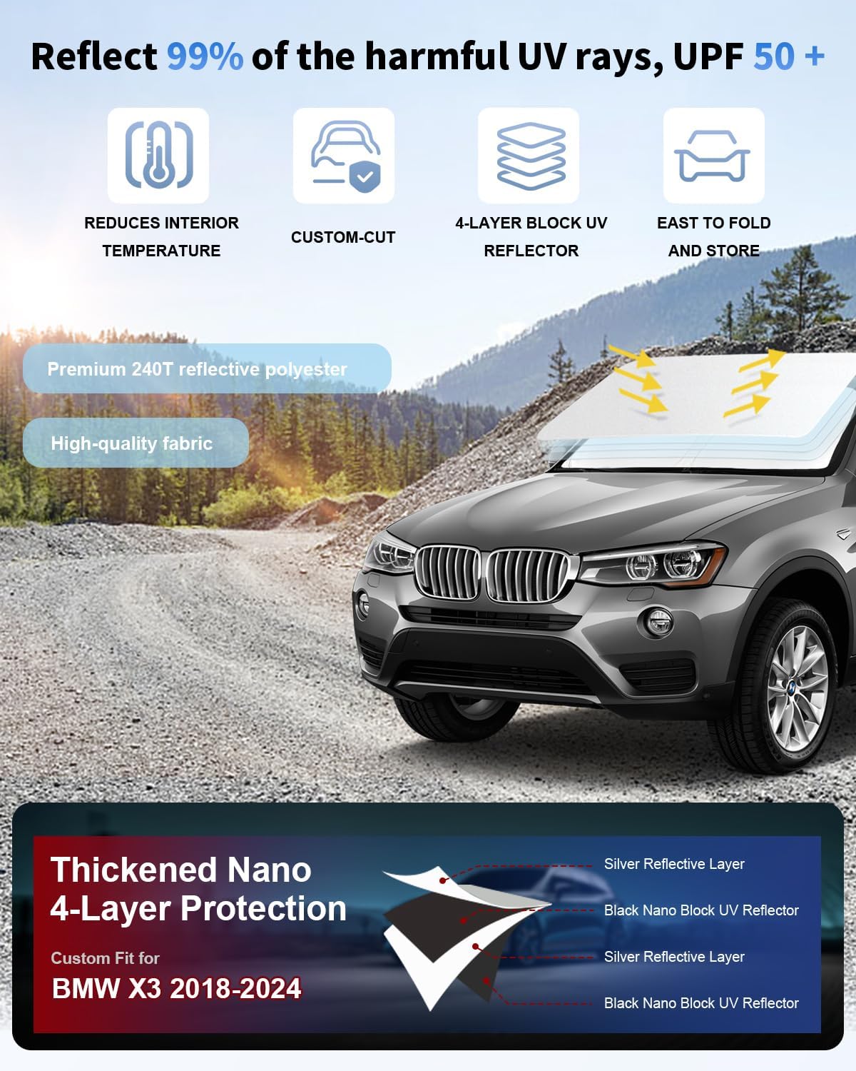 - Vehicle Service Type for 2018-2024 BMW X3 : Material Insulation layer and silver 240T reflective polyester fibre Insulation layer and silver 240T reflective polyester fibre See more