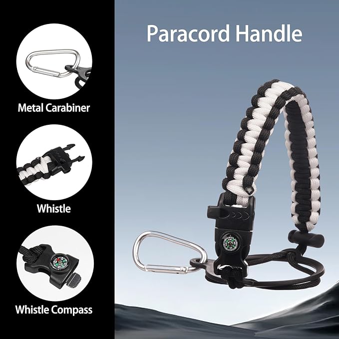 - Suitable for all occasions: This insulated water bottle comes with a beautiful hand-woven nylon paracord, and the paracord handle is equipped with a compass and carabiner and a whistle. It is a fully functional essential water bottle for camping, climbing, hiking, home use, travel, cycling, swimming fitness, and commuting