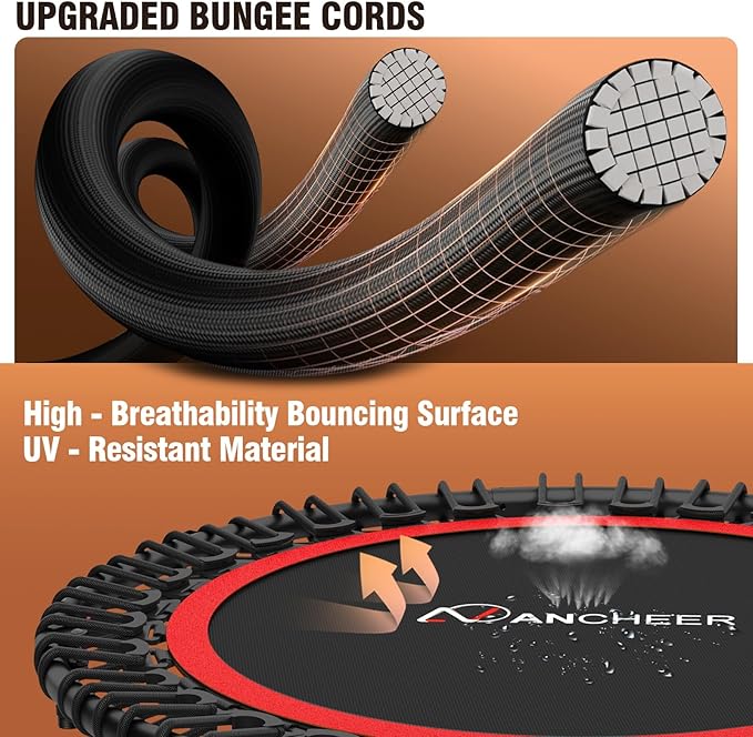 - Professional Mini Fitness Trampolines: The more you bounce, the more comfortable. ANCHEER is dedicated to the most scientific way of bouncing. Upgraded 1.2mm thickened bungees provide smoother and more stable bouncing assistance. Linear bungee feedback reduces the impact of intense bouncing on the knee joint.