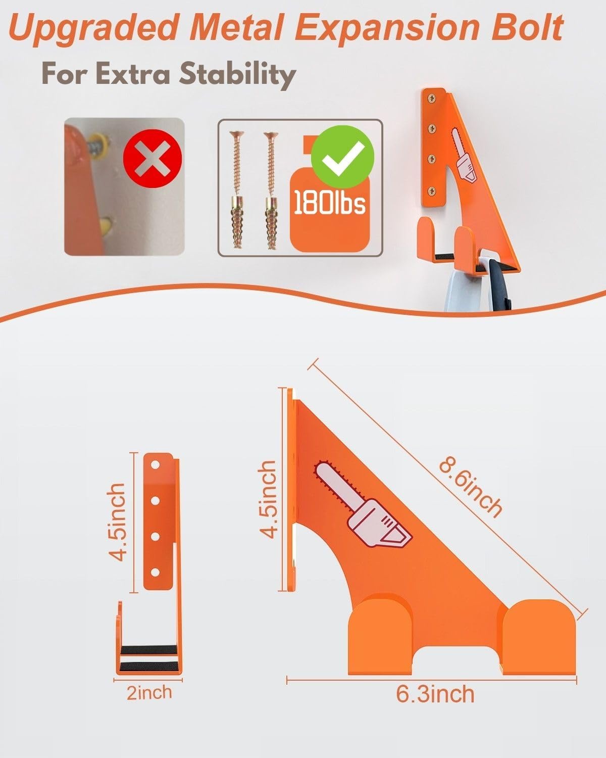 - 💪【Heavy Duty Alloy Steel Chainsaw Holder】Built with 3mm Alloy Steel (180LB load capacity), this chainsaw stand outperforms iron/plastic by 30% in weight-bearing. Heavy-duty metal expansion screws fit most walls with 3X stronger hold vs. plastic anchors.
