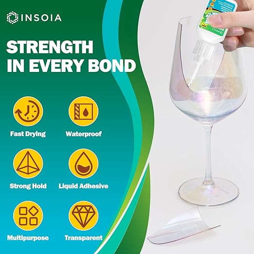 - ?§Š?�Super Glass Glue?‘INSOIA crystal clear Glass Glue is engineered with a professional-grade formula that creates super-strong, invisible bonds for glass-to-glass repairs and other materials. It adheres seamlessly to surfaces without becoming brittle or losing strength over time. Whether you're repairing broken glassware, vases, mirrors, or decorative items, this glue ensures a durable and reliable hold, making it perfect for both household and professional repairs.