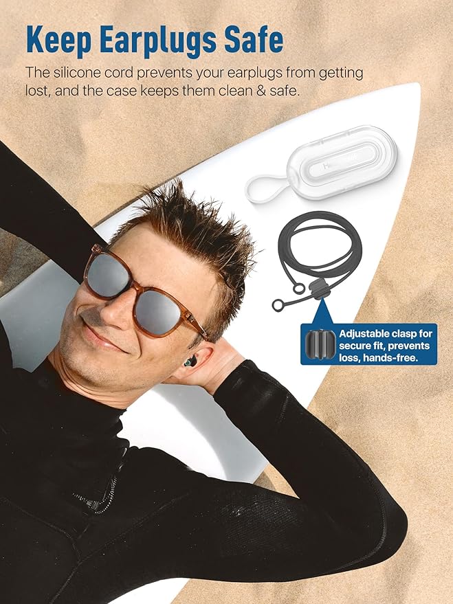 - Secure and Adjustable Fit: Featuring ergonomic wings and customizable ear wings(S, M), these earplugs provide a snug, personalized fit for most ear sizes. The adjustable connecting cord and clasp keep them securely in place, even during intense water activities, and prevent loss