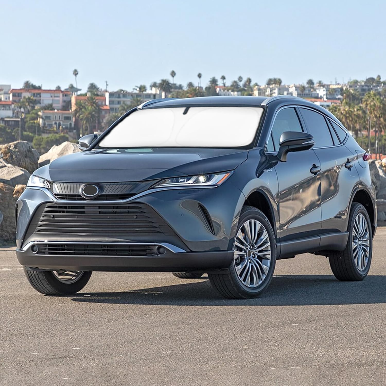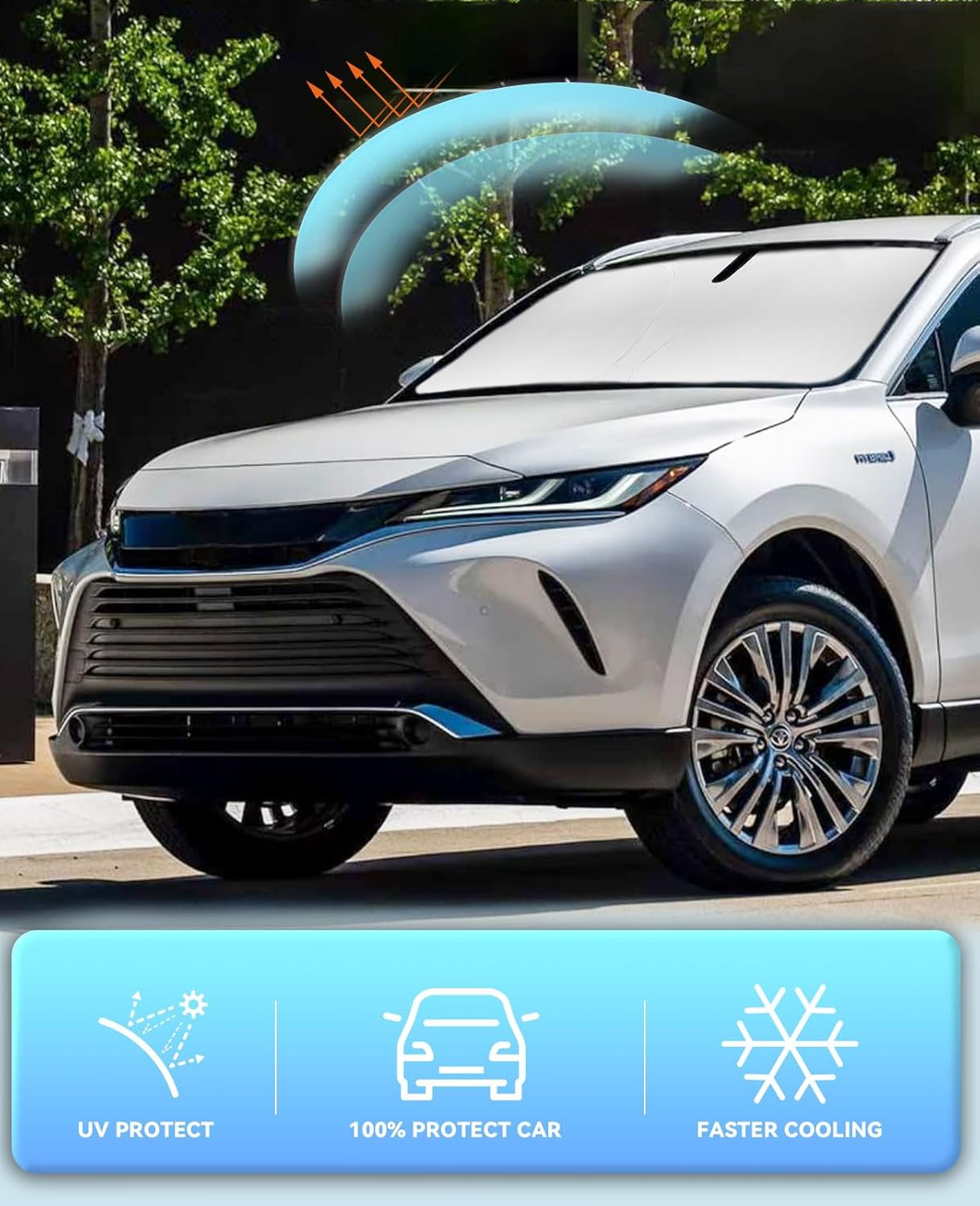 - 【Vehicle Specific】Our Windshield Shade Cover custom fit for 2020 2021 2022 2023 2024 2025 Toyota Venza, LE, XLE, Limited, SUV ,Full covered your windshield,No Gap,100% Perfect fit. The precise fit design and reinforced steel ring are sufficient to allow the sun shade to precisely fit the front window without the need for suction cups to hold it in place, effectively protecting your car from the sun's rays.