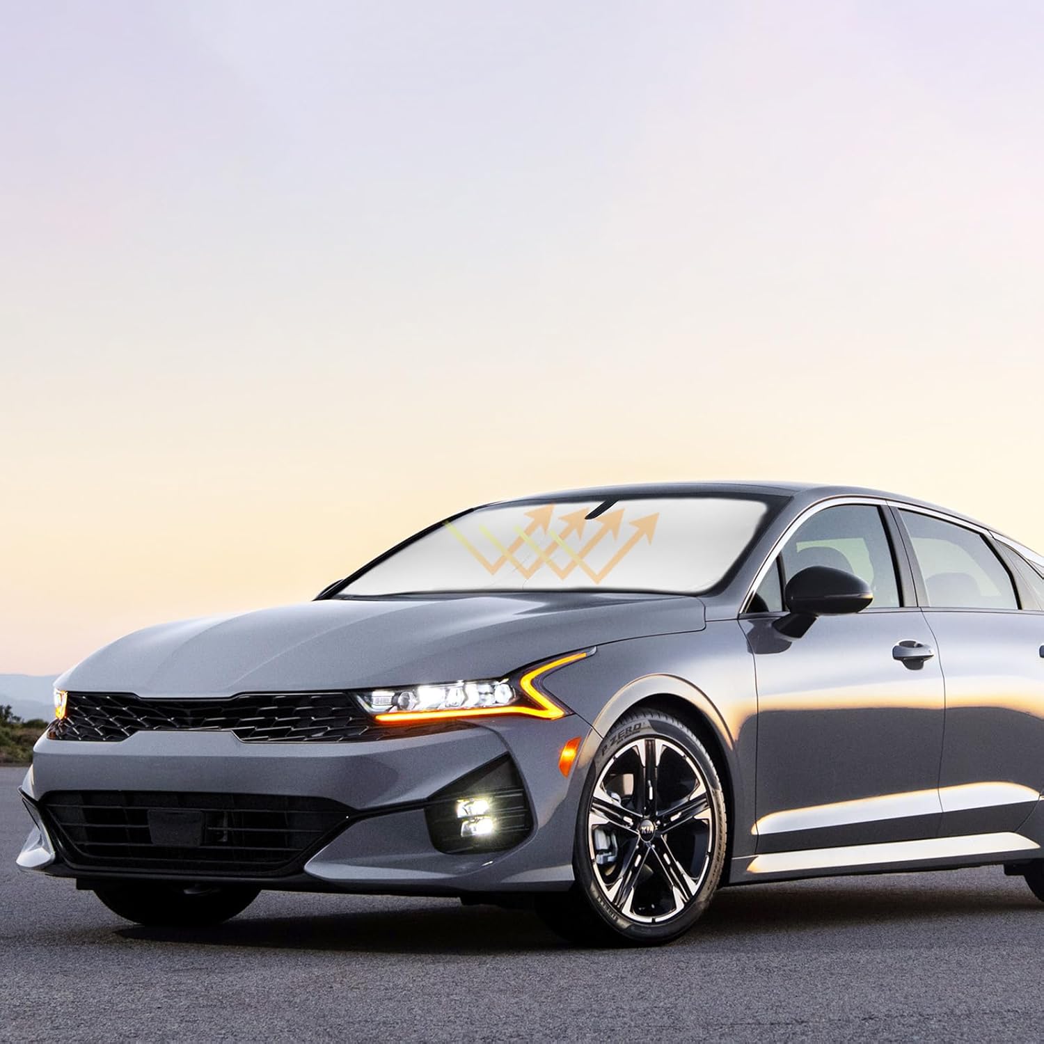 - 【Vehicle Specific】Our Windshield Shade Cover Custom Fit for 2021-2024 2025 2026 Kia K5, GT-Line, GT, Premium Plus, Prestige Crossover SUV, Full covered your windshield,No Gap,100% Perfect fit. The precise fit design and reinforced steel ring are sufficient to allow the sun shade to precisely fit the front window without the need for suction cups to hold it in place, effectively protecting your car from the sun's rays.