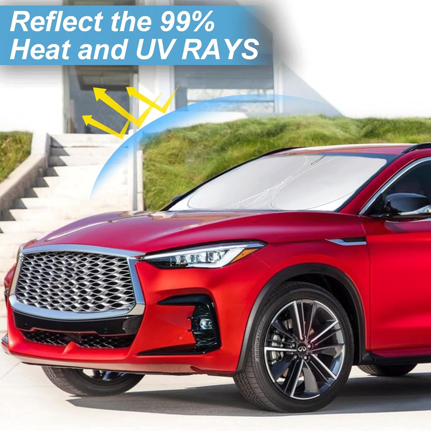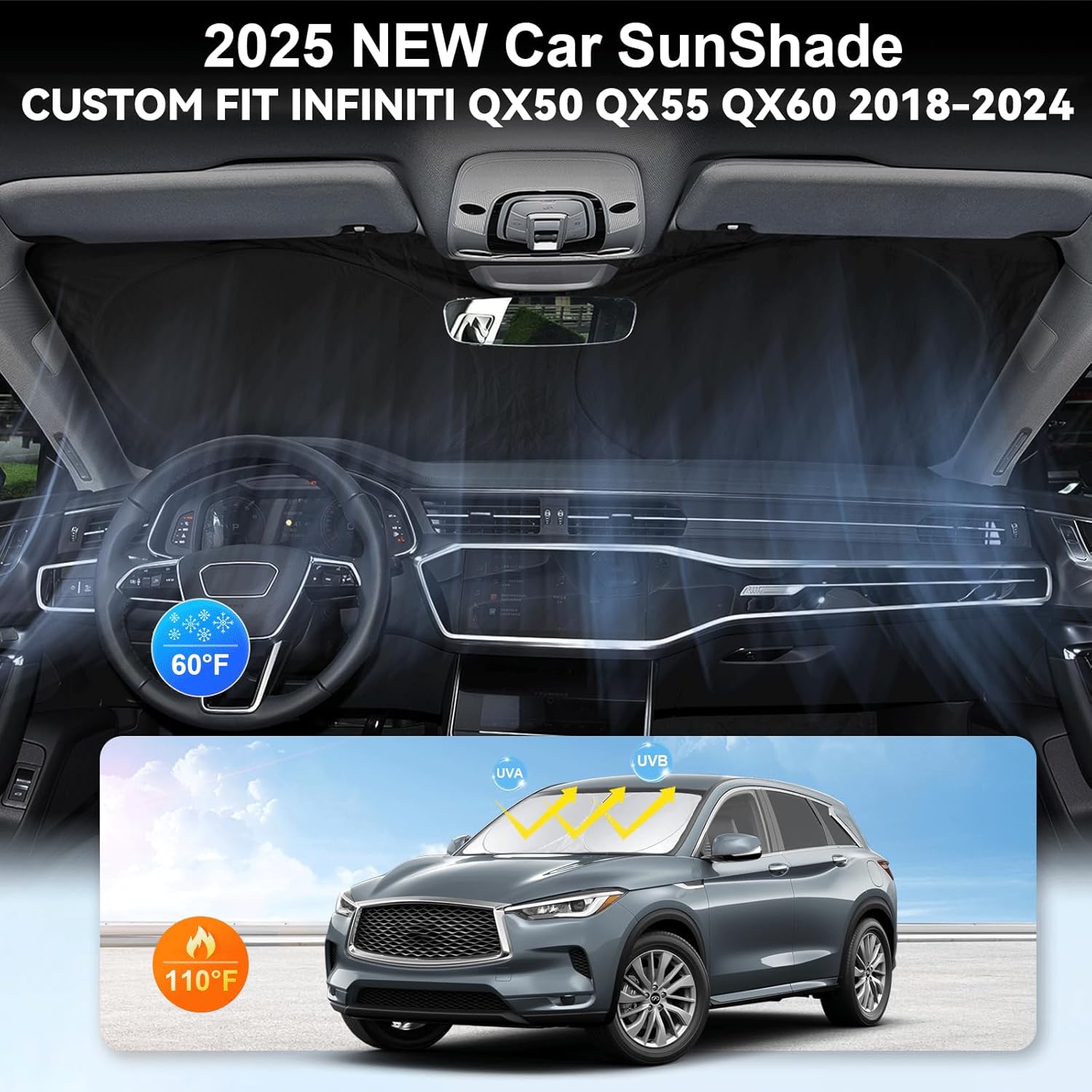 - [CUSTOM-FIT FRONT WINDSHIELD SUNSHADE] Automotive windshield sun shade is Specifically designed,which for Infiniti QX50 QX55 QX60 QX80 2026 2025 2024-2018 accessories. We have several size of car sunshade. Please measure your car size and refer to our size before your purchase. Once installed it won't have gaps, sags or slumps like other car sun shade windshield