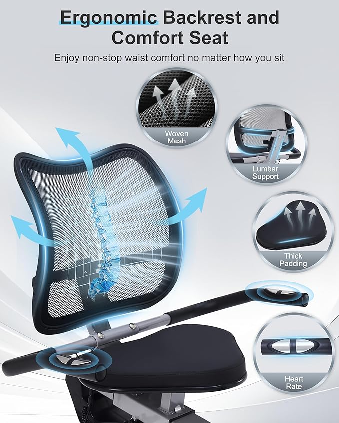 - 【Adjustable Comfort Seat and Ergonomic Backrest】Our recombinant exercise bike features an infinitely adjustable seat position,allowing you to easily tailor the seat to your unique needs. The breathable mesh backrest significantly boosts airflow and is ergonomically designed to ensure continuous lumbar comfort.
