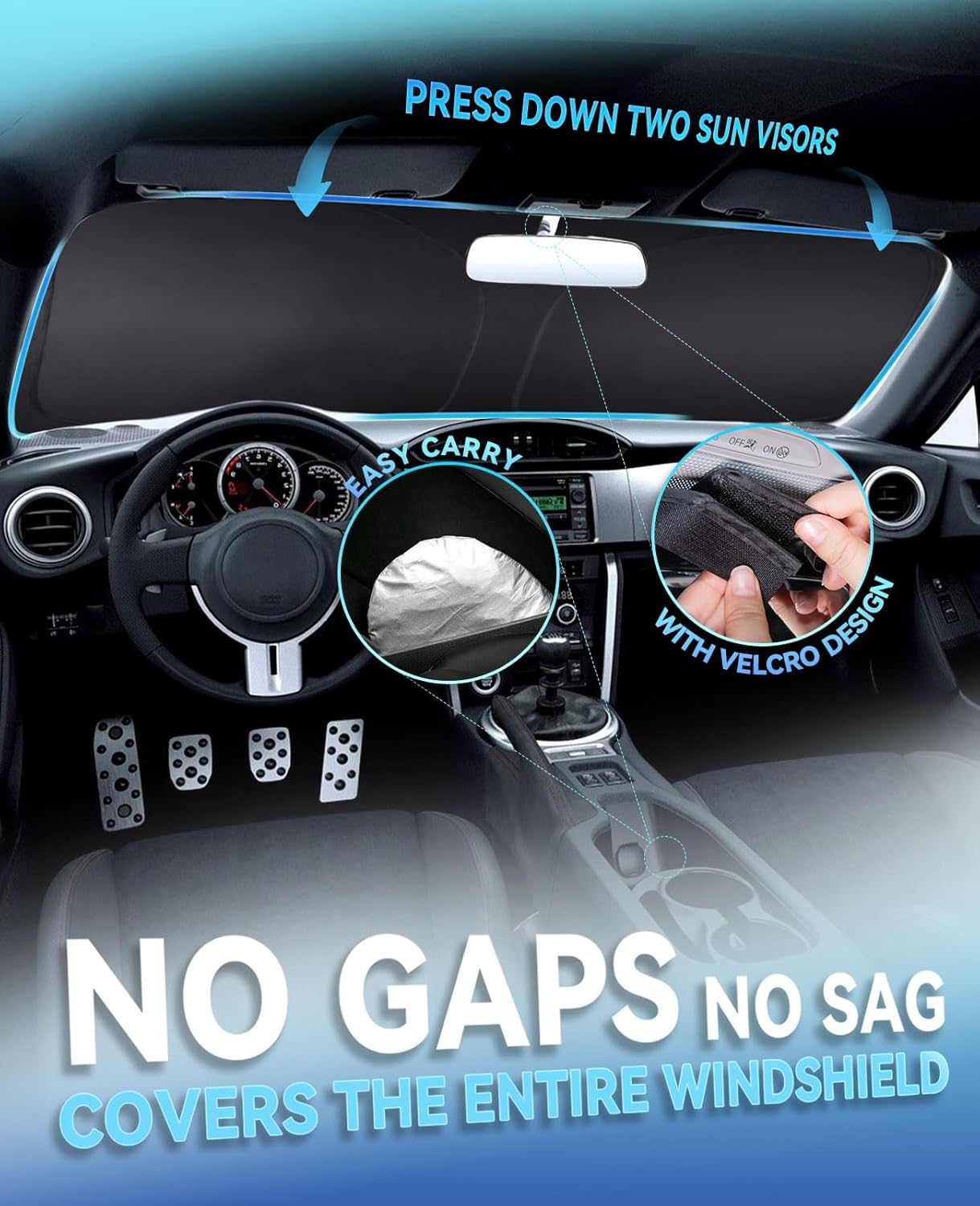 - 【99% UV PROTECTION】 - Dual-Layer design, providing better protection against Sun, blocks up to 99% of damaging UV rays and Heat build-up. With this windscreen sun shade, it can safeguard the car interior from detrimental UV rays and heat that would cause the dashboard and seats to fade. When you travel by car or need a nap, the custom-fit Windshield Shades can block 99% of the sun shine and UV rays, providing more protection for you and your family.