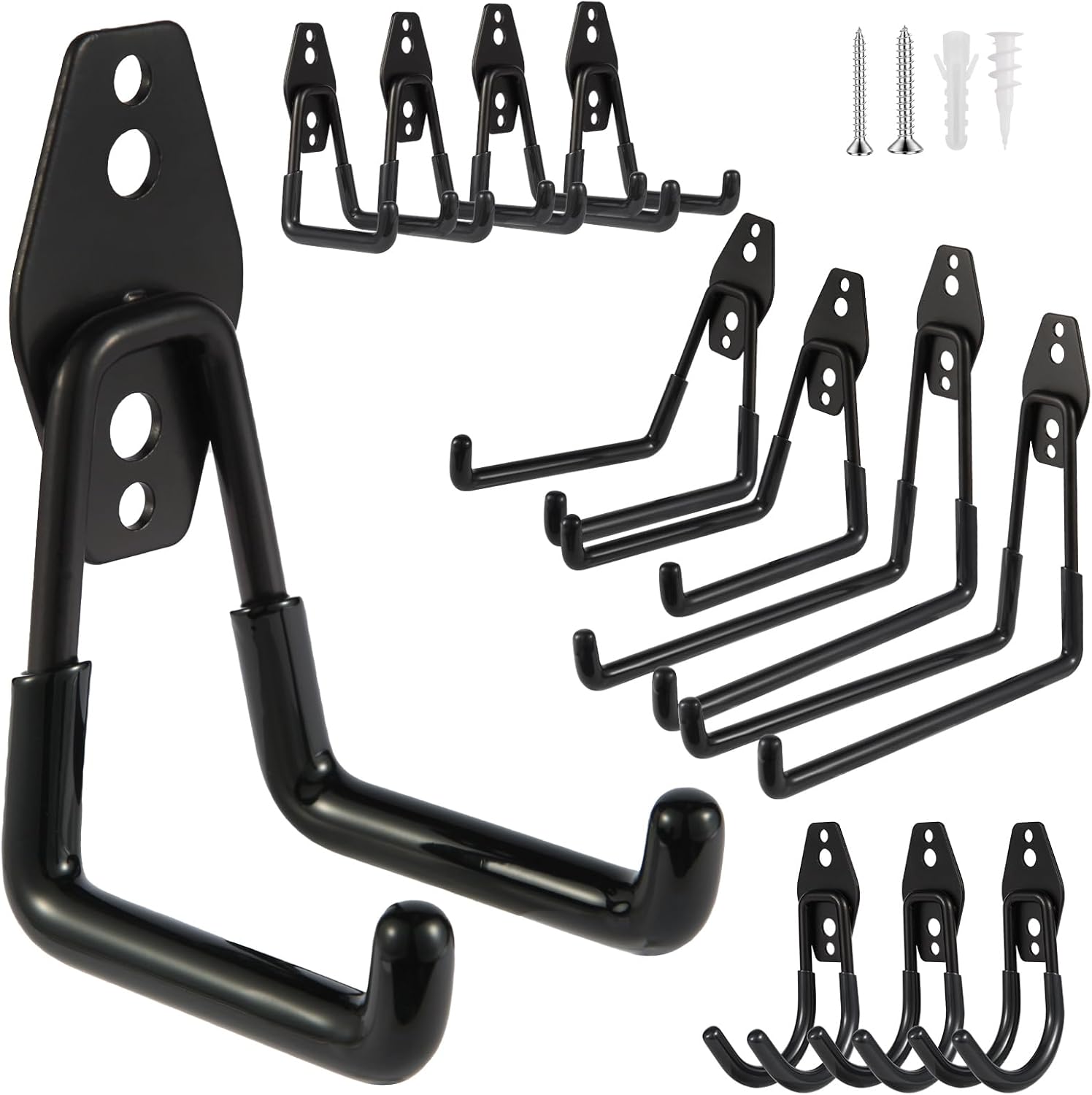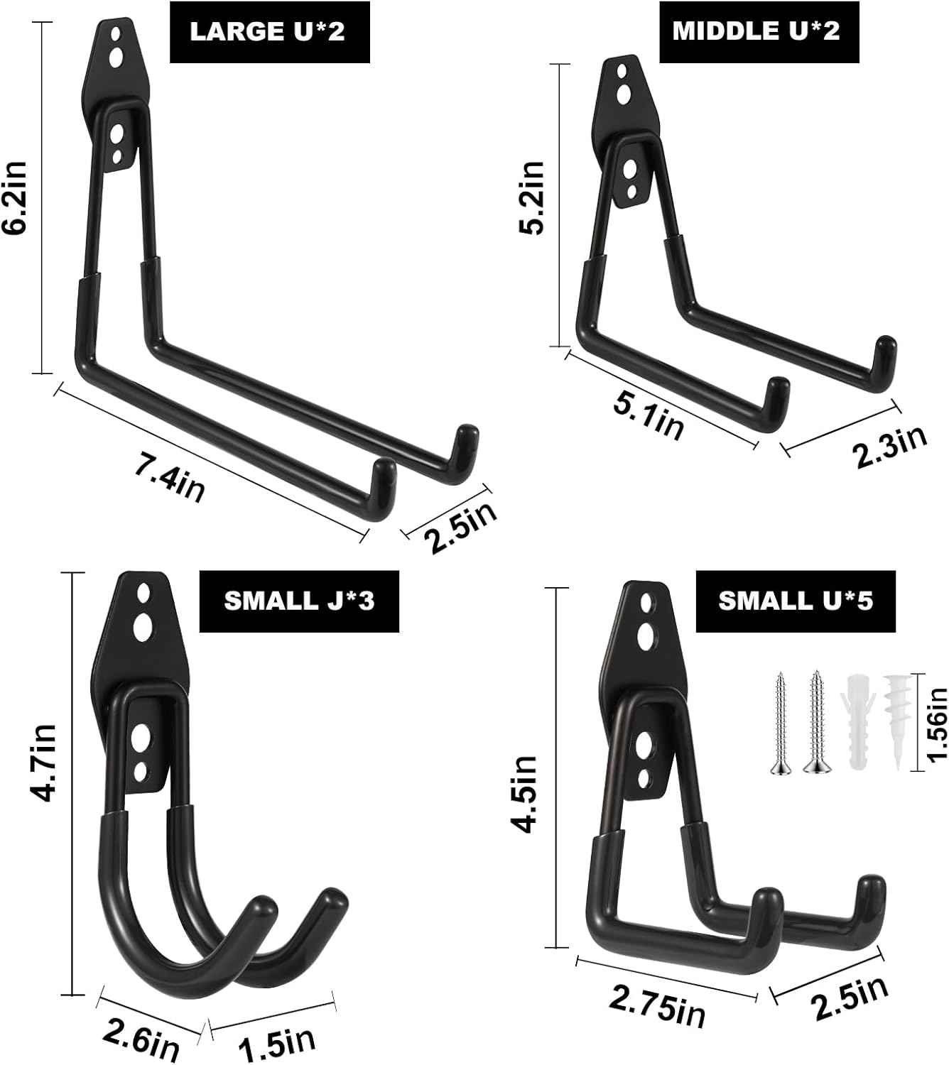 - ZexHok Wall Hook Assortment Set: 12pcs storage hooks include with 4 sizes: 3pcs small J hooks, 5pcs small U hooks, 2pcs middle U hooks and 2pcs large U hooks, for hanging tools of different sizes and weight.