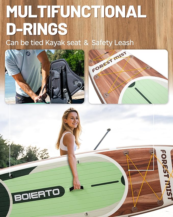 - 【EXTRA STEEL D RINGS】Boierto installs 4 D rings on both sides of the middle part of the paddle board, the kayak seat can be installed on the paddle board through these D rings, or connect your paddle board with your friend's through them,hang your oars, anchors, waterproof bags, or other portable tools